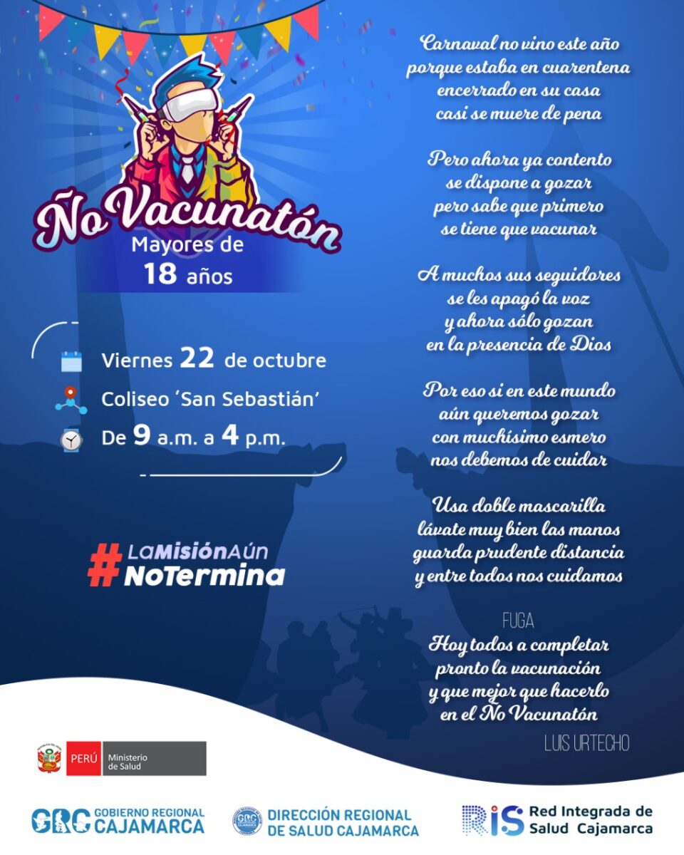 El doctor Miguel Santacruz, de la Red Integrada de Salud (RIS) Cajamarca, invitó a la población a participar del ‘Ño Vacunatón’ contra la covid-19 que se realizará hoy viernes 22 de octubre desde las 9 de la mañana. Resaltó que, a través de esta estrategia, que se realiza por segunda ocasión, se busca incentivar a los jóvenes a participar del proceso de inmunización a quien aún falta aplicar primeras y segundas dosis.