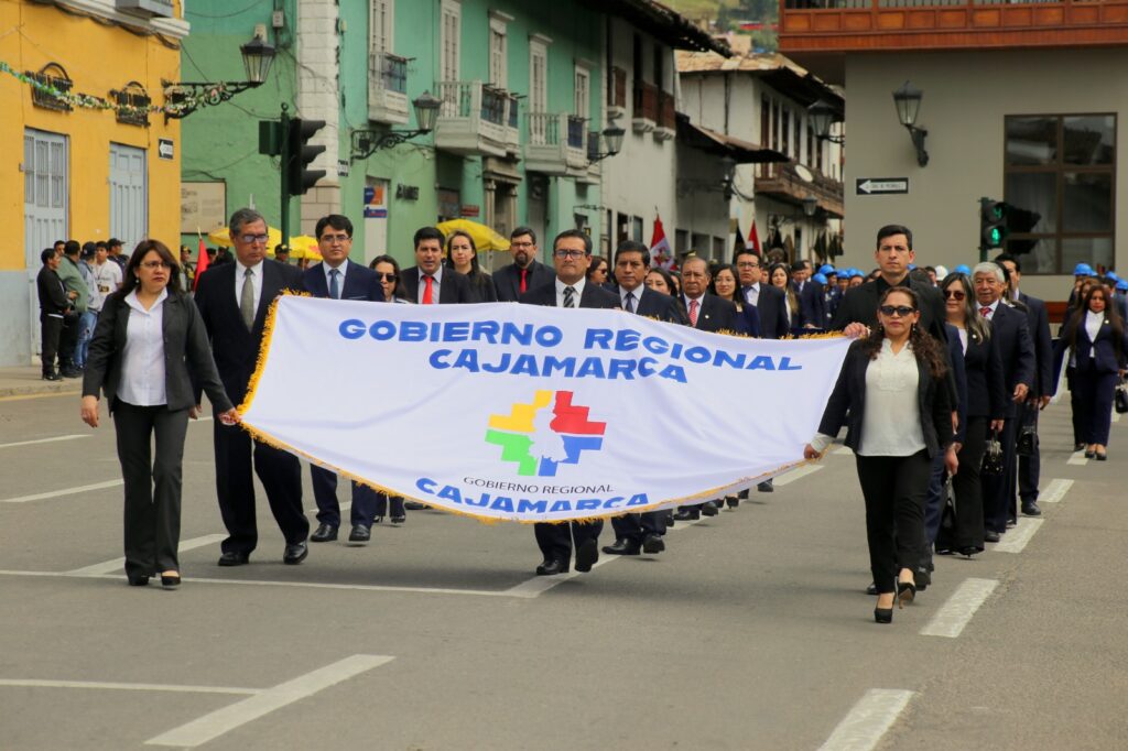 Funcionarios y servidores de la Gerencia Regional de Planeamiento, Presupuesto y Ordenamiento Territorial participaron del desfile de honor portando los símbolos de identidad del Gobierno Regional de Cajamarca.