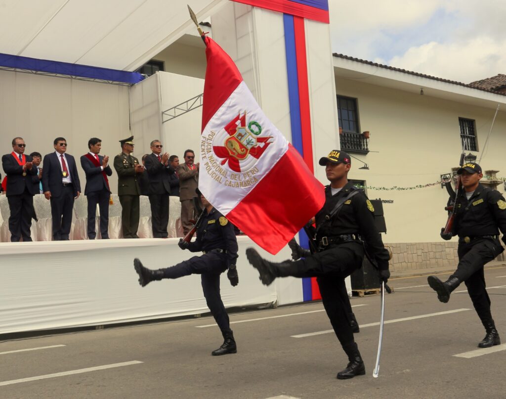 Bajo los rayos de un imponente sol, la plaza de Armas de Cajamarca nuevamente fue escenario del izamiento de la Bandera el Perú y la entonación de las sagradas notas del Himno Nacional.