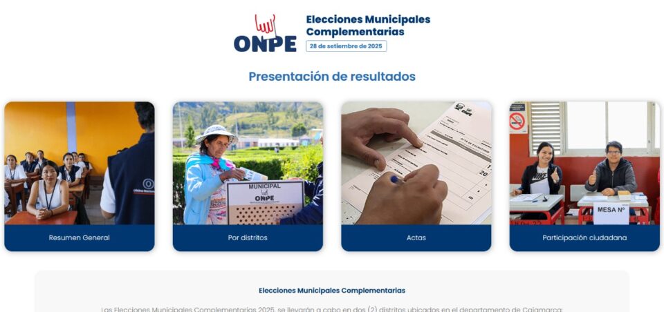La Oficina Nacional de Procesos Electorales (ONPE) publicó en su portal institucional un link con los resultados de las Elecciones Municipales Complementarias realizadas en los distritos cajamarquinos de Ninabamba y Pion, a fin de elegir sus autoridades municipales.